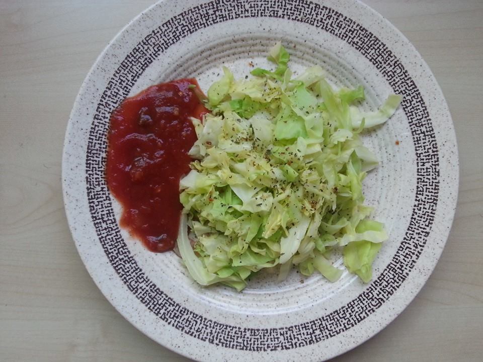 The prep was simple sliced and shredded the cabbage, sprinkled with a little Mrs. Dash salt free seasoning and 2 tablespoons of La Victoria.